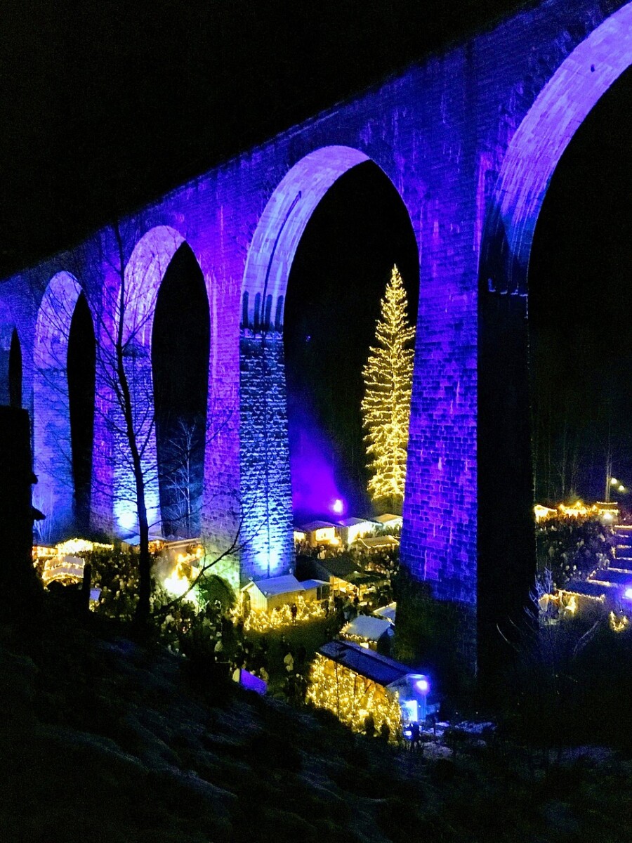 Zu den wohl schönsten Weihnachtsmärkten gehört der an der Ravennaschlucht, die nur etwa eine Stunde vom Hotel Hochblauen entfernt liegt. Dieser in seiner Art einzigartige Weihnachtsmarkt findet unter einer beeindruckenden, 40 Meter hohen Eisenbahnbrücke statt und erstrahlt abends in grünem und violettem Licht. Eine zauberhafte Kulisse in der Nähe unseres Wellnesshotels für Weihnachten im Schwarzwald für Ihre Weihnachtseinkäufe und um die hier angebotenen Spezialitäten zu probieren.