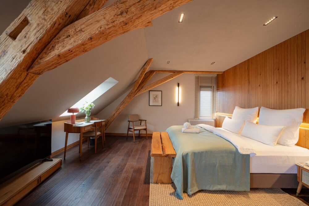 Unsere Junior Suite mit Alpenblick ist mit 40 bis 45 m² das großzügigste Zimmer im Haus und überzeugt mit unaufdringlicher Eleganz. Inspiriert von der unverfälschten Einfachheit der Natur, prägen warme, erdige Töne das Ambiente. Die Farbgestaltung spiegelt die bewaldeten Hänge und felsigen Gipfel wider, die Sie direkt von Ihrem Fenster in diesem Wellnesshotel in Deutschland bestaunen können. Diese Suite in unserem Wellnesshotel mit Kindern in Deutschland heißt bis zu vier Gäste willkommen, die in einem Kingsize-Bett (180 x 200 cm) und zwei Einzelbetten (90 x 200 cm) bequem Platz finden. Unsere Junior Suite mit Blick auf die Alpen befindet sich im Alpine Wing, der auch den Wellnessbereich beherbergt.